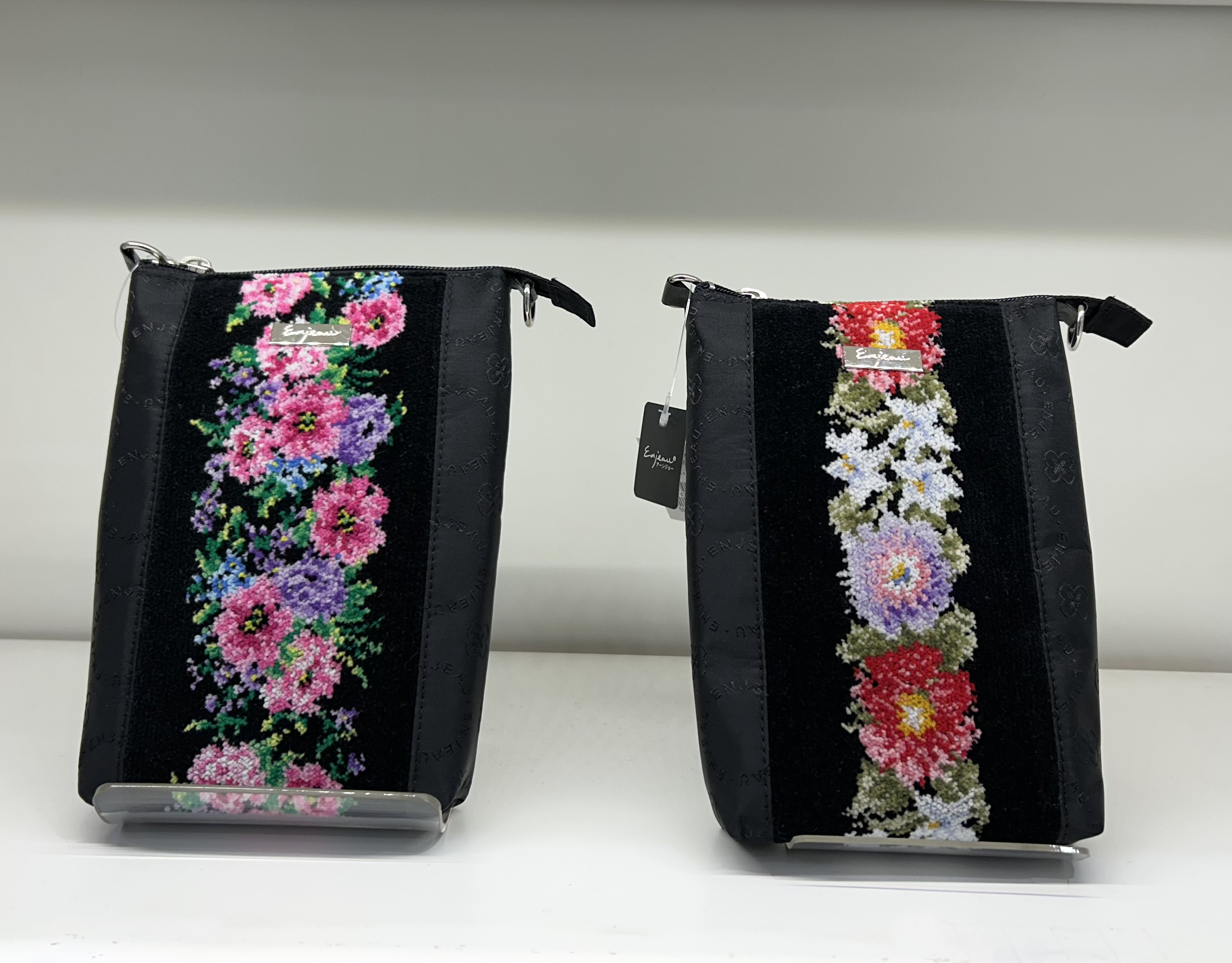 日本製シェニール織生地を中央部に華やかに使い、日本製ナイロンジャガード生地をベースに使った、軽量で汚れにも強いサコッシュ型ショルダーポーチ◎