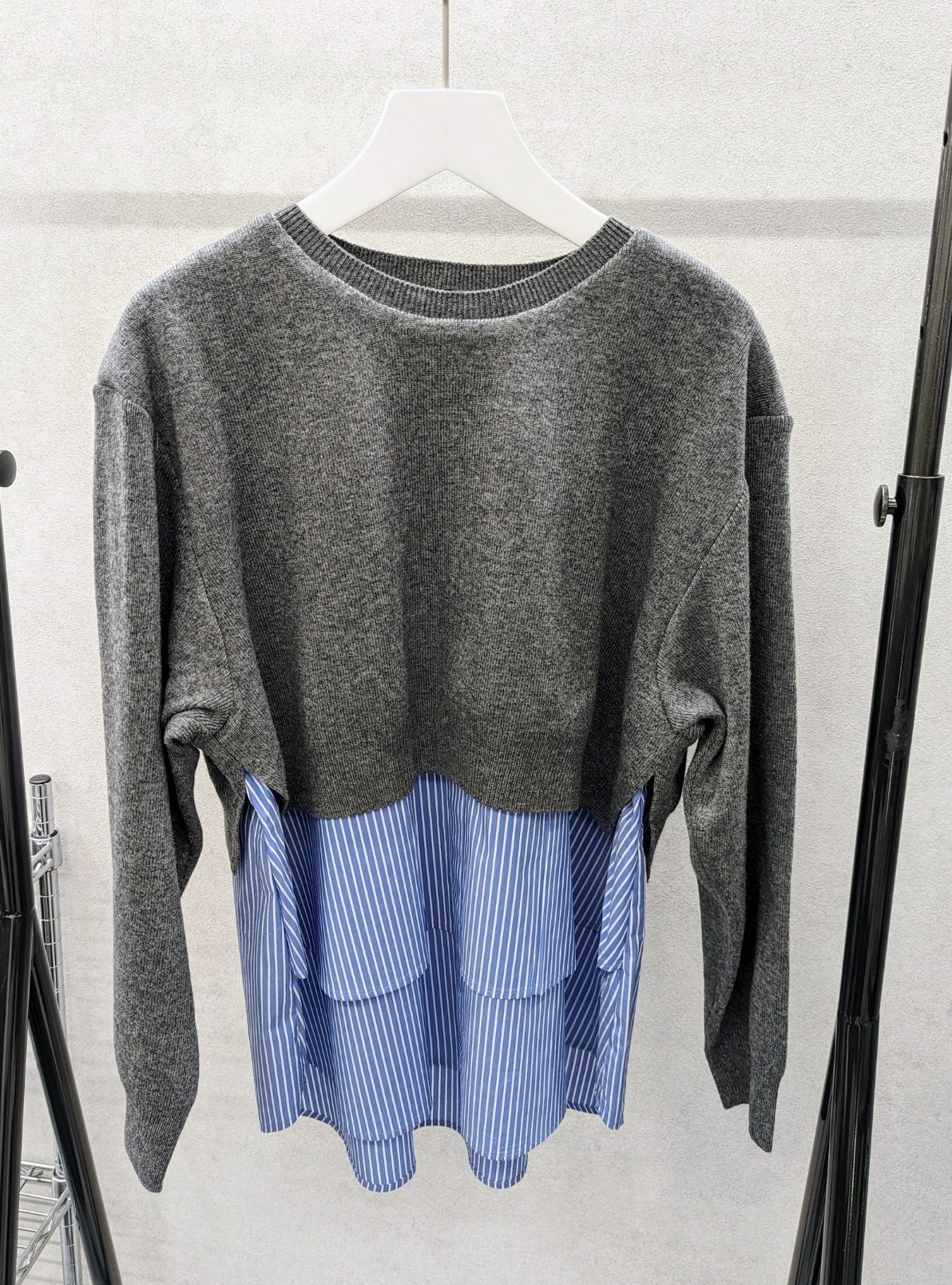 シャツとクロップドニットを重ね着しなかのようなデザインの異素材コンビニット。