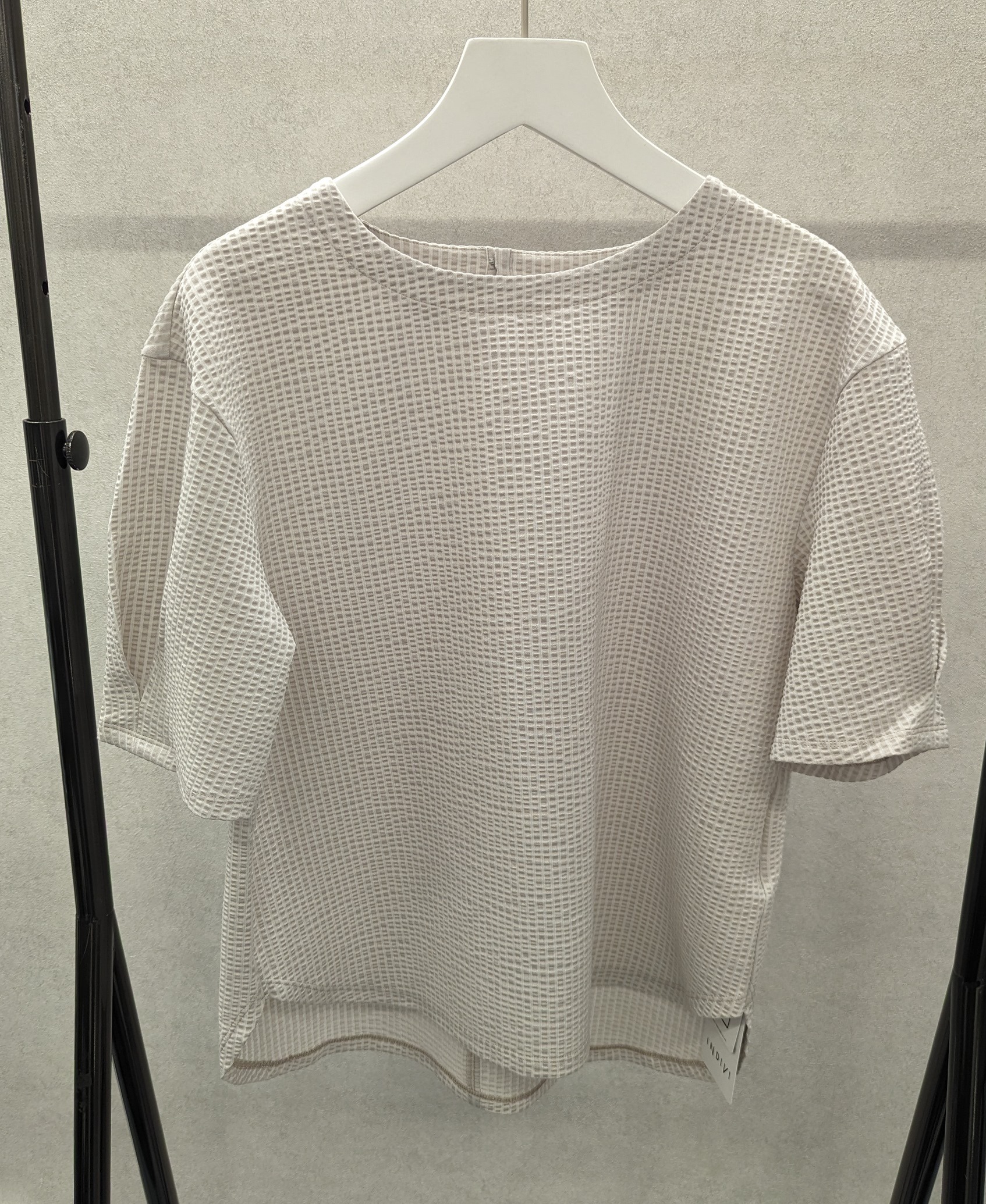 表面に凹凸感のあるストライプジャージを使用したブラウス見えトップスは、ジャージならではのストレッチ性で着用は軽く、きちんと見えも叶う一枚。