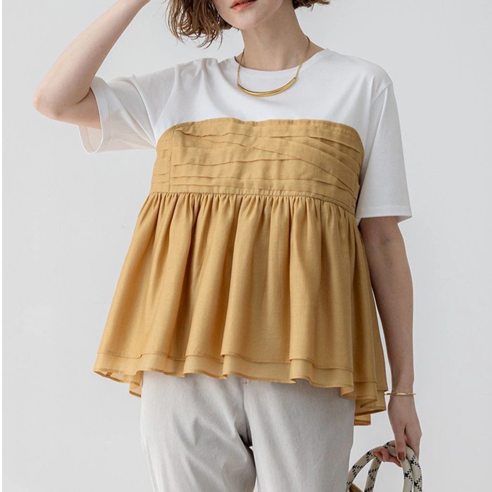 上品な透け感とやわらかい風合い、優しい発色が特徴のオーガンジーをTシャツにレイヤードした配色で、同素材のブラウスとの合わせもこなれた雰囲気になりおすすめです♡